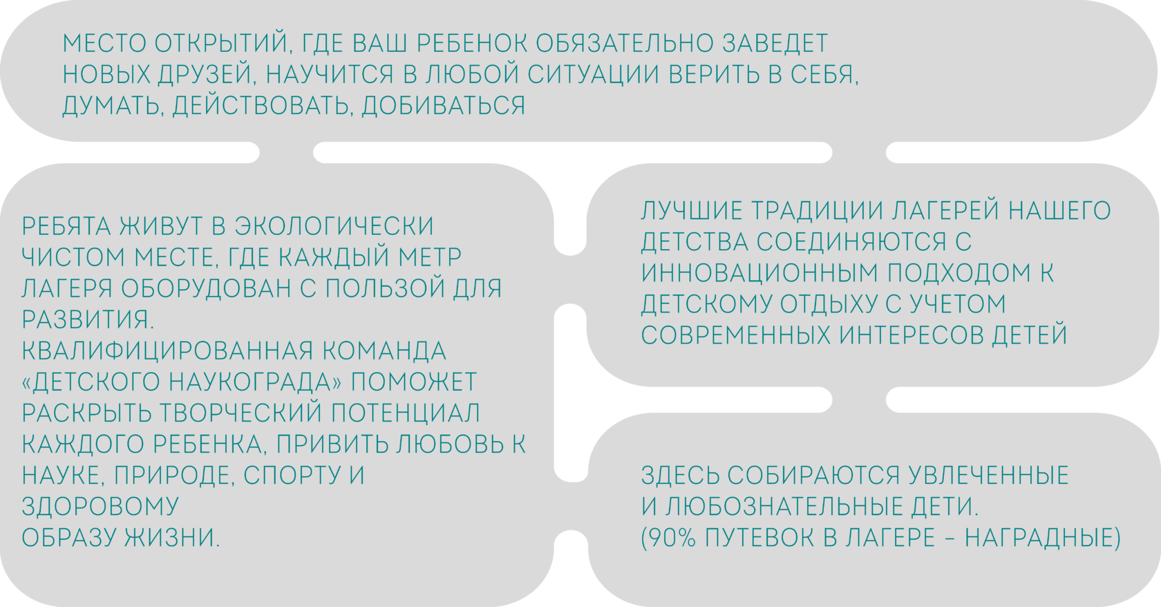 Воспитательно - образовательная программа «Детского Наукограда» — это многодневная игра, детям ежедневно доступно более 40 кружков и интерактивных занятий, которые будут полезны каждому ребенку (здоровый образ жизни, коммуникации, безопасность).